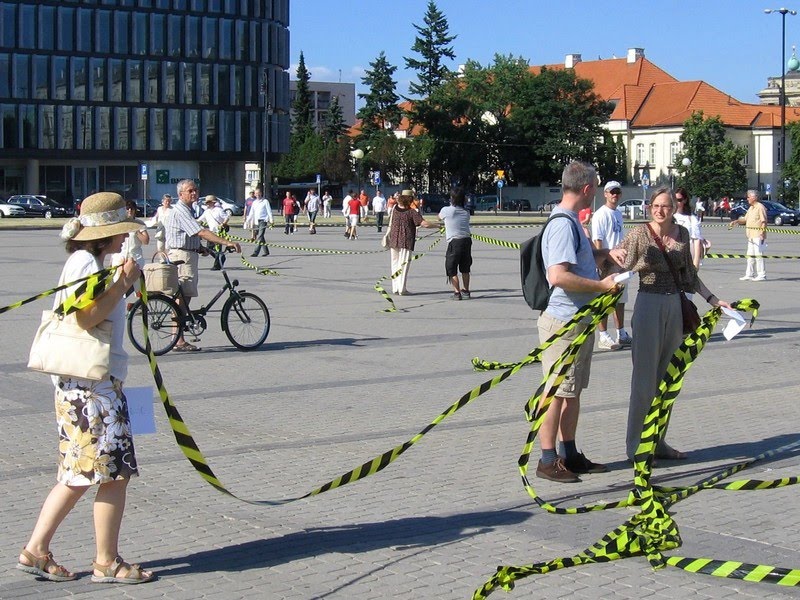 I to było moim zdaniem nie do końca przemyślane. Z poziomu ziemi nie było w ogóle widać zarysu samolotu. Mógł być widoczny jedynie z góry, a akurat na pl. Piłsudskiego i wokół niego żadnego wyższego punktu nie ma. Na początku osoby, które się zbierały na placu naturalnie zaczęły gromadzić się wzdłuż taśmy wyznaczającej obrys samolotu i przez to kształt tupolewa zaczynał być dobrze widoczny. Niestety, sami organizatorzy kazali "uwolnić obrys" samolotu. Zupełnie niepotrzebnie moim zdaniem. Oczywiście zwróciłem im na to uwagę, ale nie okazali się na tyle lotni, żeby z mojej wskazówki zrobić użytek.