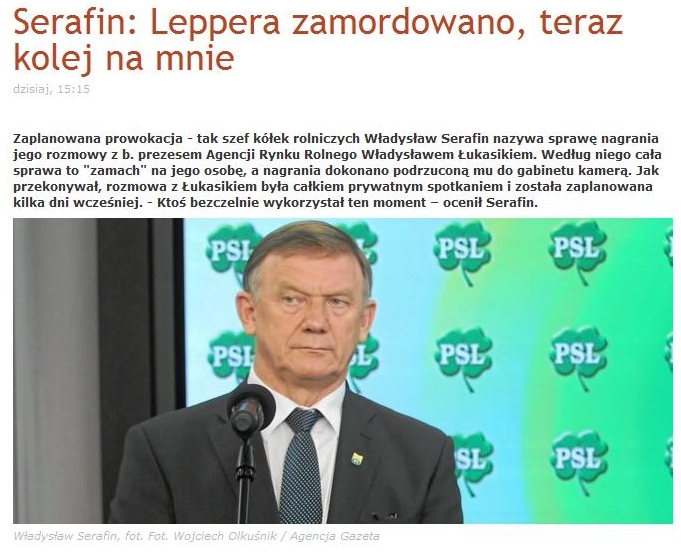 Zastanawiająca jest jego niemal desperacka obrona poprzez wskazanie, - prawdopodobnie "dysponentom nagrania" - iż wie na pewno, że A. Lepper został zamordowany. O tym fragmencie jego oświadczenia - wedle mnie kluczowym - nie usłyszałem w żadnym wieczornym wydaniu telewizyjnych wiadomości, które skupiły się na planowanej dymisji Marka Sawickiego. Wydaje się, że sama decyzja o tej - jedynie planowanej - dymisji miała być może właśnie niejako przykryć wagę słów, które - w odniesieniu do śmierci A. Leppera - wypowiedział W. Serafin  oraz prewencyjnie zapobiec dalszym atakom na PSL i oddalić planowaną zapewne zamianę w koalicji rządowej PSL na RPP + SLD.