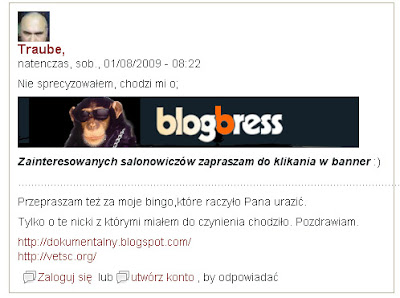 Pod koniec lipca, po powrocie z urlopu zauważyłem na stronie Blogmedia24, w komentarzu niejakiego Natenczasa, bezpodstawną napaść na kilku moich kolegów z Blogpressu oraz dodatkowo „graficznie” na moją osobę. Agresja zastosowana na mojej osobie polegała na perfidnym i wyjątkowo chamskim zniekształceniu bannera portalu Blogpress poprzez zamianę nazwy na „Blogbress” i zastąpienie zawartego w nim orła przez małpę (sic!).Pomijając fakt, że tego typu czyn jest niemoralny, chamski i na dodatek karalny, stanowił on też wyraźny sygnał, o wypowiedzeniu otwartej wojny naszemu portalowi.