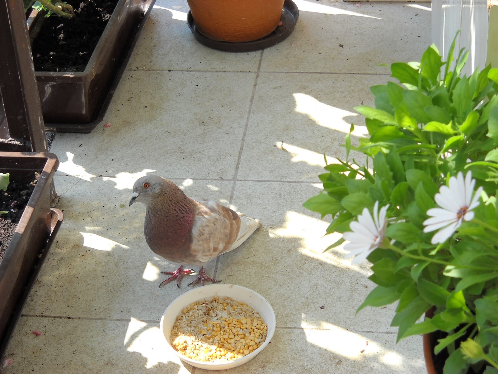 Gospodarz balkonu, gołąb Donek, śniadanko zajada