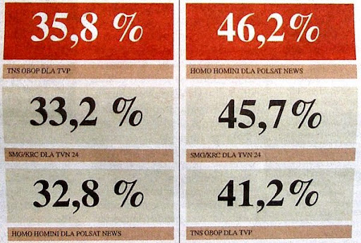Wrócę dzisiaj do sprawy zakłamanych sondaży podawanych przez media wrogie Polsce takie jak właśnie gazety Agory, czy prywatne telewizje, w których Komorowski ma przyjaciół, czyli TVN i Polsat. Zakłamane były sondaże przedwyborcze jak i sondażowe wyniki wyborów. Co jest celem tego kłamstwa? Osłabienie woli zwycięstwa u Kaczyńskiego i jego sympatyków? Wywołanie na rzecz marszałka tzw. „efektu kuli śniegowej”? A może przykrycie fałszerstwa wyborczego? Każda z tych możliwości może być trafna. Wracam do tego dzisiaj, bo chciałbym, by pewne moje spostrzeżenie pozostało w przestrzeni publicznej (choćby w niszy), a po wyborach sprawa będzie miała już znaczenie wyłącznie historyczne.