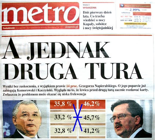 W powyborczy poniedziałek 21.06.10 na jedynkach polskich dzienników pojawiły się informacje o wynikach wyborów. W chwili oddawania gazet do druku PKW jeszcze obliczała głosy więc pole do manipulacji było nadal otwarte. Redaktorzy „Metra” wykorzystali ten fakt przy użyciu całej pełni swojej nikczemnej wyobraźni. Artykuł na pierwszej stronie był podpisany nazwiskiem i pseudonimem: Mariusz Jałoszewski, akar. Z kolei grafika z wynikami wyborów była podpisana nazwiskami: S. Kamiński, W. Olkuśnik. Dodajmy jeszcze, że „Metro” jest czytane bardzo pobieżnie, częściej właściwie tylko przeglądane, w drodze do pracy, w środkach komunikacji. Nikt tej gazety nie studiuje dokładnie, a autorzy biorą to pod uwagę przy układaniu swoich manipulacji.
