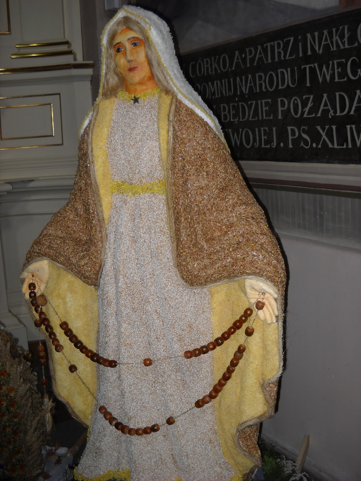 Ta figura Matki Boskiej jest całkowicie wykonana z ziaren zbóż