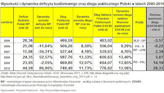Według szacunkowych jeszcze danych polski wzrost PKB w 2011 roku wyniósł 4,3% co winno dać PKB w wysokosci około 1.476 mld zł. Szacowany dług publiczny to 815-840 mld zł, co stanowi 55,2 - 56,9 szacowanego PKB. Niezależnie jednak na ostateczne i ewentualnie pewne już "cuda Rostowskiego" mające na celu krajowe zmniejszenie procentowej relacji wartości długu do wartości PKB do poziomu poniżej 55%, nasze zadłużenie jest ogromne i wzrosło za czasów rządów D. Tuska o około 290 mld zł (o ponad 55% w stosunku do roku 2007!). Według FOR państwowy dług publiczny per capita (na 1 mieszkańca) wyniósł w roku 2011 aż 21.891 zł i był o 1.810 wyższe niż w roku 2010. Deficyt budżetowy Polski wyniósł prawdopodobnie około 25 mld zł i był zbliżony do tego z lat 2008, 2009 więc wielkie peany, że deficyt został radykalnie zmniejszony są jak zwykle PR-ową grą rządu D. Tuska, który pomija horrendalny wzrost deficytu w roku wyborczym 2010...