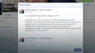 Na facebookowym koncie Giertycha, w dniu wczorajszym, równo o 21.00 pojawił się wpis: „Jest godzina 21 dnia 24.05 AD 2015. Pewnie przecieracie oczy ze zdziwienia. Oto kandydat PiS, który głosił Waszym zdaniem »średniowieczne poglądy« rozbił w puch Bronisława Komorowskiego, który przez 5 lat prezydentury cieszył się rekordowym poparciem społecznym. Nie będę tutaj mówił »a nie mówiłem« i odsyłał Was do moich apeli i wołania od dwóch lat, abyście nie skręcali w lewo. Powtarzałem to w dziesiątkach wywiadów"