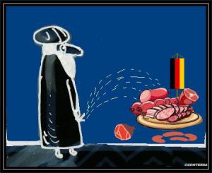 Moni Rötzsch, prowadząca w krytej pływalni w Norbad w Neuss bar szybkiej obsługi twierdzi, że muzułmanie nie tylko nie życzą sobie, by podawała w swoim barze wieprzowinę, ale domagają się także, by dania drobiowe, które zamiast tego wzięła do menu, były przyrządzane na innym tłuszczu, innej patelni a najlepiej „w innym miejscu”.”*