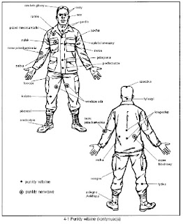 (3). Pacha. Duży nerw leży blisko skóry pod każdą pachą. Cios w ten nerw powoduje silny ból i częściowy parazliż. Nóż wbity pod pachę jest śmiertelny, ponieważ przecina tętnice prowadzącą z serca.