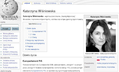 P.S. Nie mogłem odmówić sobie wykonania brakującej karty Wikipedii z nazwiskiem wielce zasłużonej Pani Redaktor. Brak jej nazwiska w popularnej encyklopedii było wielkim przeoczeniem, a nie opisanie tak znaczącego dzieła jakim jest stworzenie pisowskiego europarlamentaryzmu po prostu zaniedbaniem.Pani Katarzyno specjalnie dla Pani...